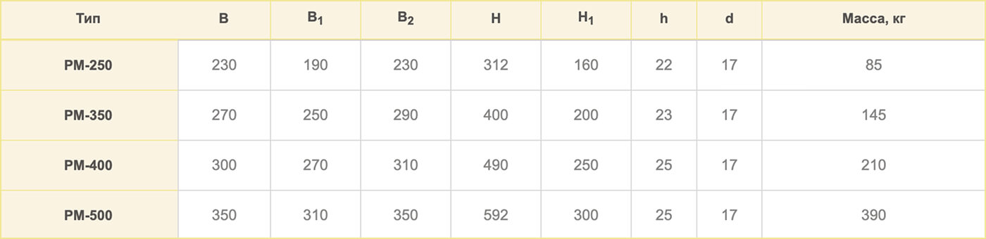 ТАБЛ 1. Габаритные и присоединительные размеры. РМ-250, РМ-350, РМ-400, РМ-500