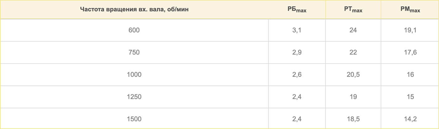 РБmax – максимально допустимая консольная нагрузка на входном валу, кН PTmax – максимально допустимая консольная нагрузка на выходном валу, кН PMmax – максимально допустимая консольная нагрузка на выходном валу в виде части зубчатой муфты, кН
