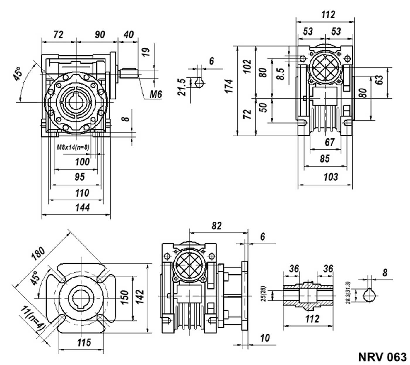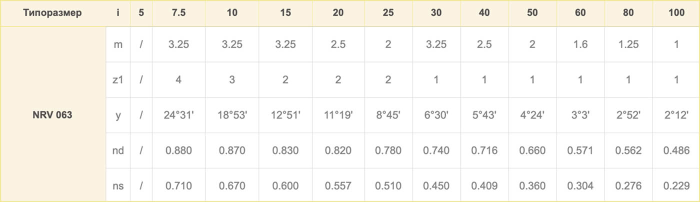 Понижающий редуктор NRV 063 с червячной передачей обеспечивает передаточные числа в диапазоне 5 — 100. Агрегат отличается надежностью, бесшумностью, невысокой стоимостью. Редуктор может поставляться с двигателем стандарта IEC мощностью до 1,5 кВт.