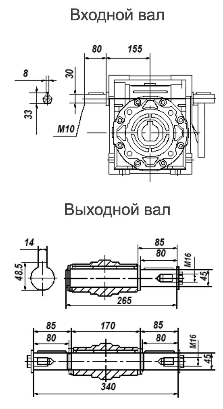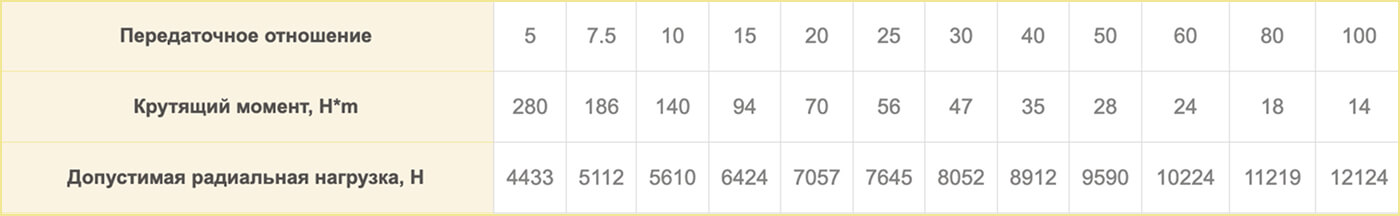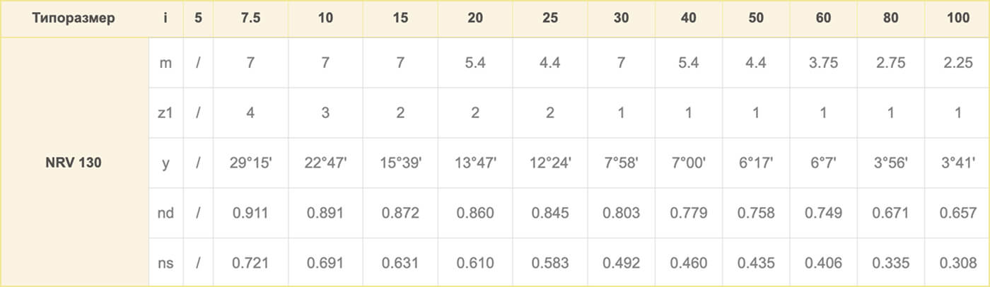 Понижающий редуктор NRV 130 развивает крутящий момент на выходе до 1500 Н*м. Передаточное отношение: 7,5 — 100. Допустимая радиальная нагрузка: до 12124 Н.