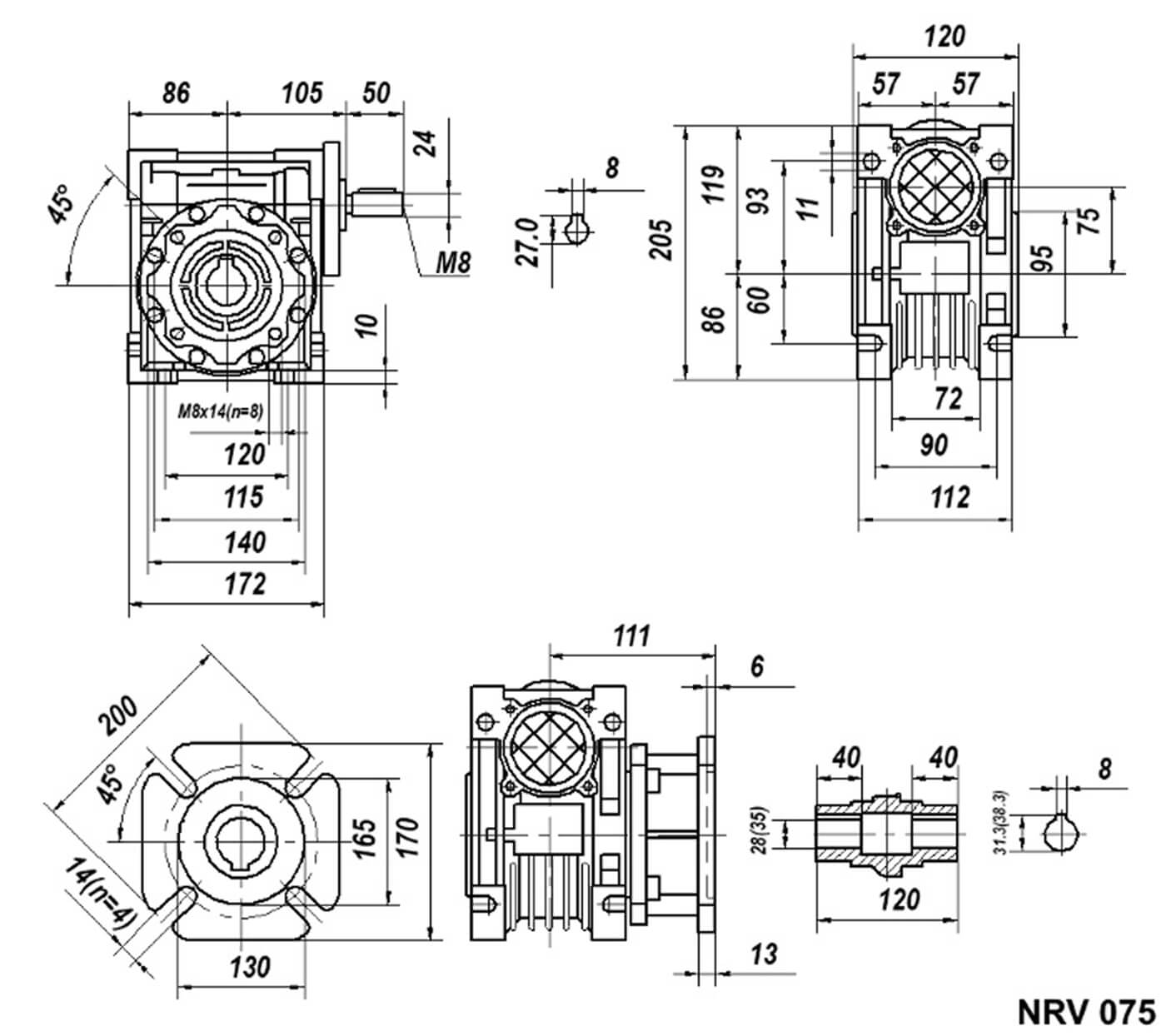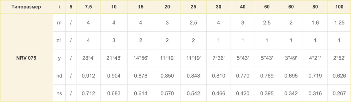 Одноступенчатый червячный редуктор NRV 075 выпускается в универсальном корпусе из алюминиевого сплава. Агрегат обеспечивает крутящий момент до 247 Н*м. Передаточное отношение: 5 — 100. Входной и выходной валы расположены под углом 90° по отношению друг к другу. На базе данного редуктора производятся мотор-редукторы NMRV 075 и PCRV 071/075.