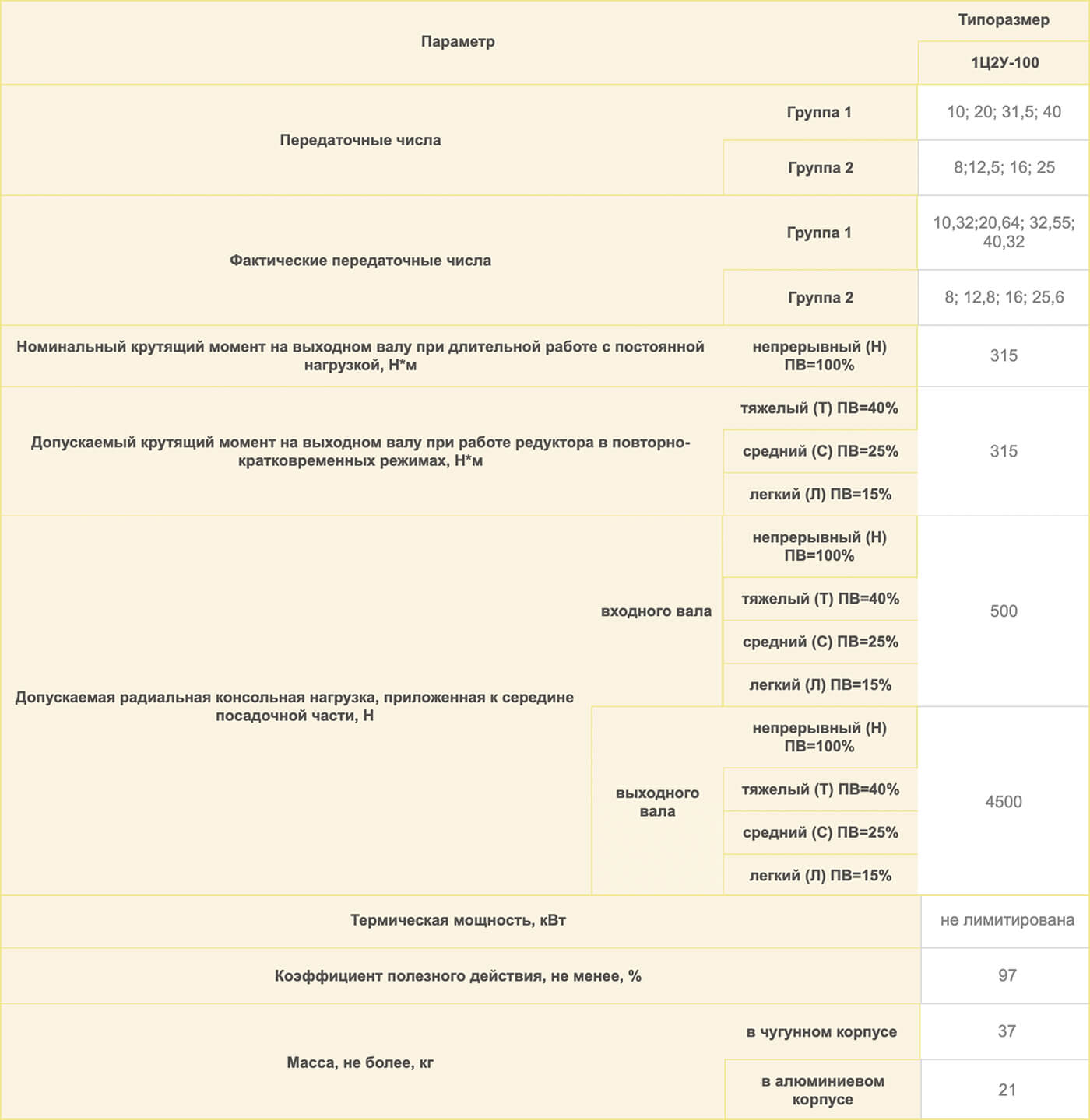 Горизонтальный узкий цилиндрический редуктор 1Ц2У-100 (Ц2У-100) имеет две передаточные ступени с зубчатыми передачами. Агрегат используется в промышленных машинах и механизмах для преобразования крутящего момента. Передаточное отношение редуктора — от 8 до 40. Номинальный крутящий момент — 315 Н*м. Корпус производится из чугуна или алюминия. Редуктор рассчитан на работу в непрерывном или повторно-кратковременном режиме с постоянной или переменной нагрузкой.