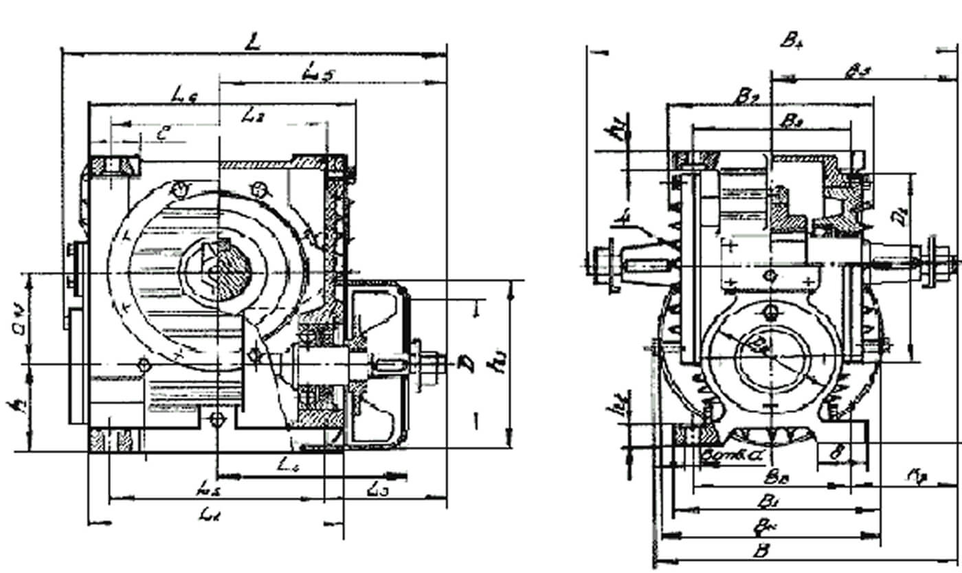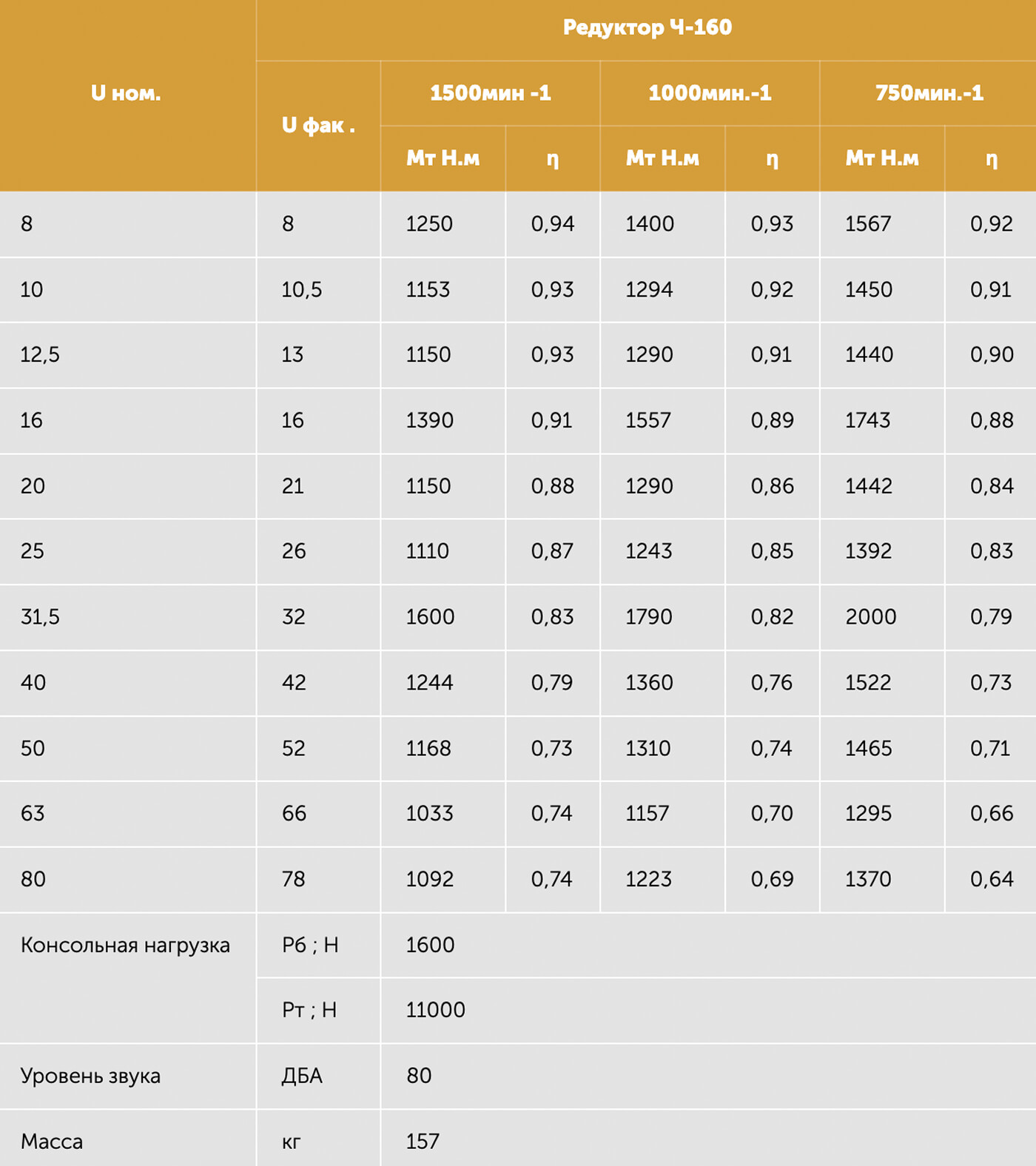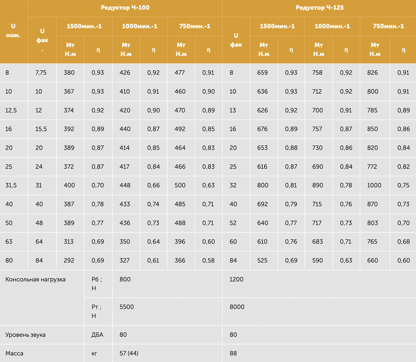 * Uном ; Uфак – номинальное и фактическое передаточное число; * 1500мин-1, 1000мин-1, 750мин-1 – частота вращения быстроходного вала; * Мт – наибольший допускаемый крутящий момент, Н·м; * η – коэффициент полезного действия; * Рб – консольная нагрузка на середину шейки быстроходного конца вала, Н; * Рт – консольная нагрузка на середину шейки тихоходного конца вала, Н; * в скобках – масса редуктора с алюминиевым корпусом.