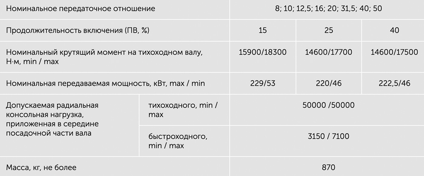 - номинальный крутящий момент на тихоходном валу: минимально – 15900, 14600 и 14600 Н•м, а максимально – 18300, 17700, 17500 Н•м.;