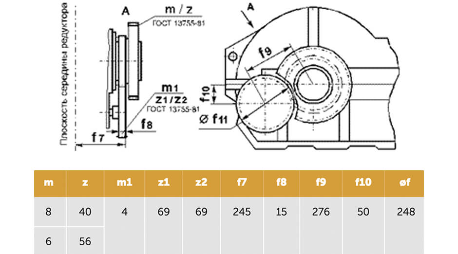 Присоединительные размеры тихоходного вала в виде зубчатой полумуфты с паразитной шестерней