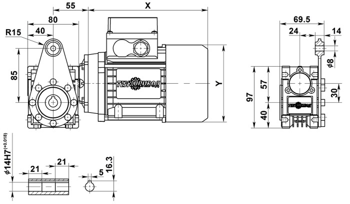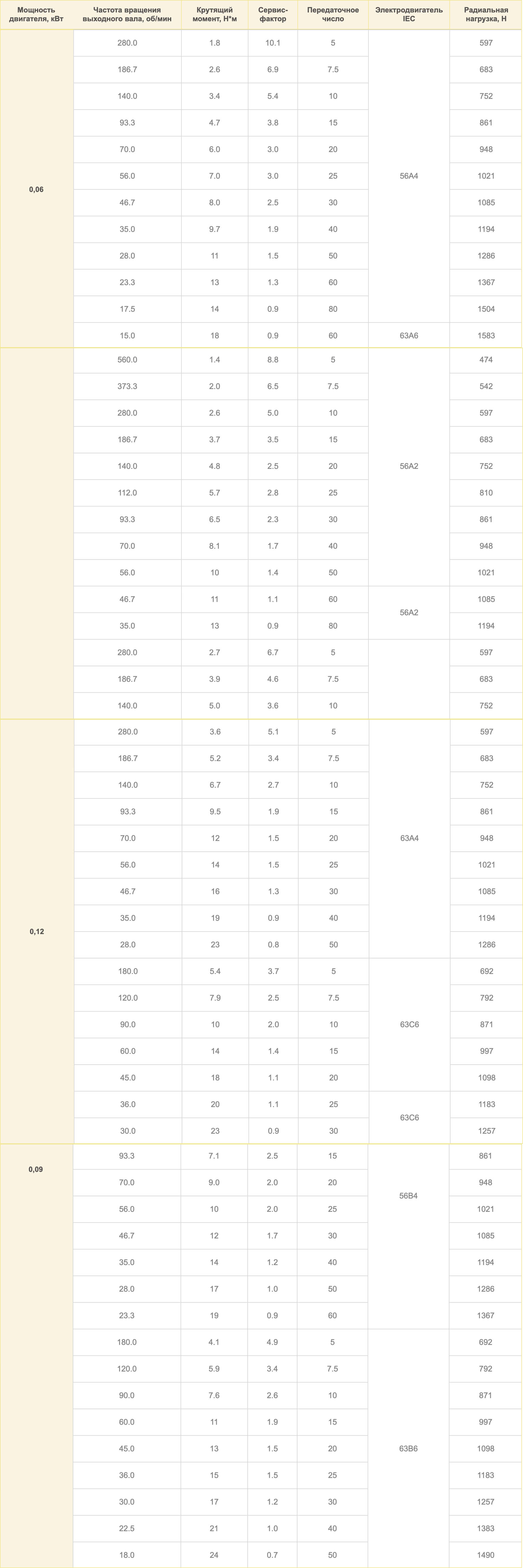 Одноступенчатый червячный мотор-редуктор NMRV 030 развивает крутящий момент до 24 Нм. Фактические передаточные числа: от 5 до 80. В состав мотор-редуктора входит трехфазный асинхронный двигатель стандарта IEC мощностью 0,06 — 0,37 кВт. Привод может комплектоваться реактивной штангой, выходным фланцем, двухсторонним выходным валом. Материалы деталей: Корпус и фланцы - алюминий, червяк - сталь, венец червячного колеса - бронза. Тип смазки: синтетическая ISO VG 320. Вес: 1,2 кг.