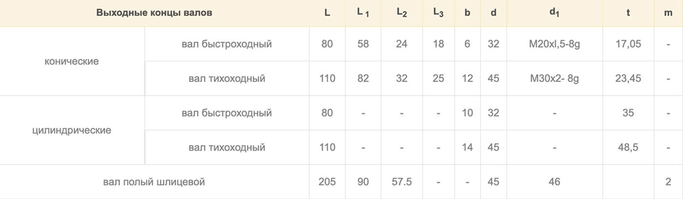 Агрегат обеспечивает передаточные числа в диапазоне от 8 до 80 при КПД до 94%. Допустимая частота вращения входного вала - 1500 об/мин. Корпус редуктора Ч-100 производится из чугуна или алюминия. Климатические модификации - исполнения "У" (умеренный климат) и "Т" (тропический климат). Привод комплектуется коническим либо цилиндрическим выходным валом.