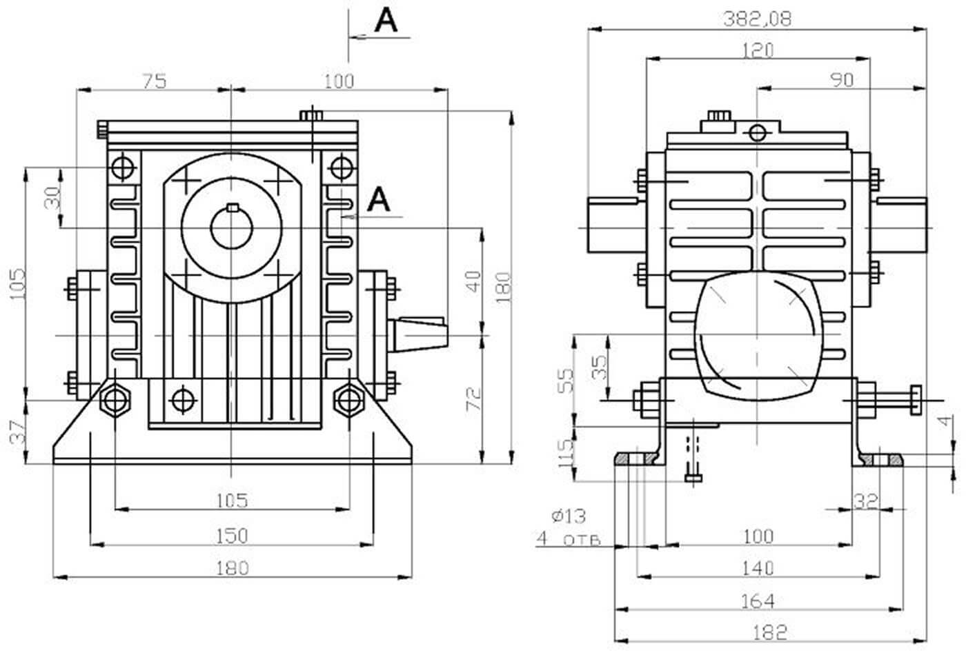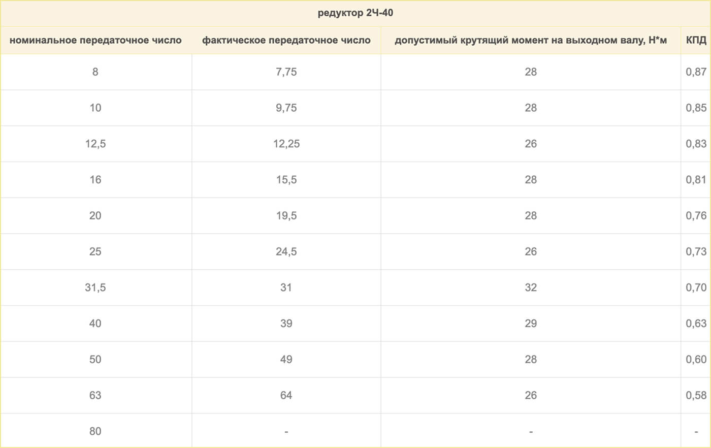 Червячный редуктор 2Ч-40 с межосевым расстоянием 40 мм используется в промышленных машинах и механизмах для изменения крутящего момента и частоты вращения вала. Привод выпускается в корпусе из алюминиевого сплава в четырех вариантах сборки. В редукторе 2Ч-40 установлена одна червячная передача, обеспечивающая номинальные передаточные числа от 8 до 80. Входной и выходной валы расположены перпендикулярно относительно друг друга. Варианты исполнения выходного вала: цилиндрический, конический, полый шлицевой, полый шпоночный.