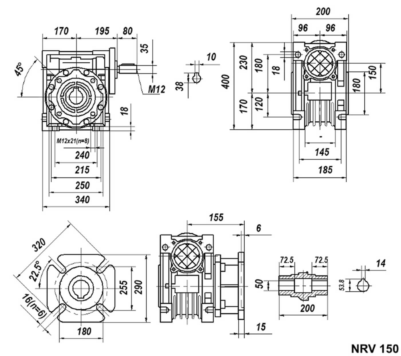 NRV - редуктор червячный 150 - типоразмер (межосевое расстояние, мм) 20 - передаточное число B7 - монтажное положение